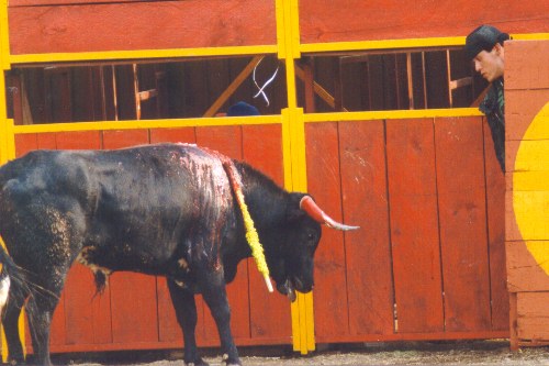 A estocada que esta foto documenta foi efectuada há uns anos por um aprendiz de matador, em Barrancos, e não foi bem sucedida. A vítima acabou por ser abatida, sob aplausos, com uma dezena de punhaladas na cabeça, por via da “puntilla” - um outro instrumento de tortura.
